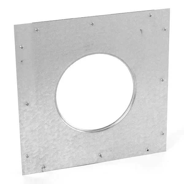 Wall firestop spacer for through-ceiling installations For use with Dura-Vent Type B Gas Vent pipes 25-year warranty For Dura-Vent Type B Vent Pipes with a 4" diameter Dimensions: 8 5/8" x 8 5/8"